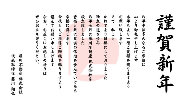2026年の新年のご挨拶。藤川不動産設立から半年を迎え、支えてくださる皆さまへの感謝を綴りました。本年もよろしくお願い致します。